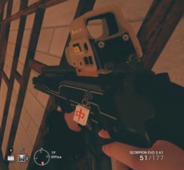 Scorpion SMG with holosight and Chun charm in Tom Clancy's Rainbow Six Siege. (2015)
