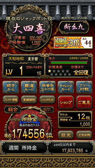 Top left: 現在のジャックポット役 Actual jackpot yaku. If you obtain this yaku you´ll get a huge boost on money points and experience points. The amount of winnable points keep going up, until one player of all of those who have this game obtain the Yaku. So only the first one get this. In the example pic on the iTunes store, the yaku is Dai Sû Shii . Below this there's the prize wich is: JP賞金 JP Prize of 500,000 JP 経験値 JP Experience Points 1,000 points.